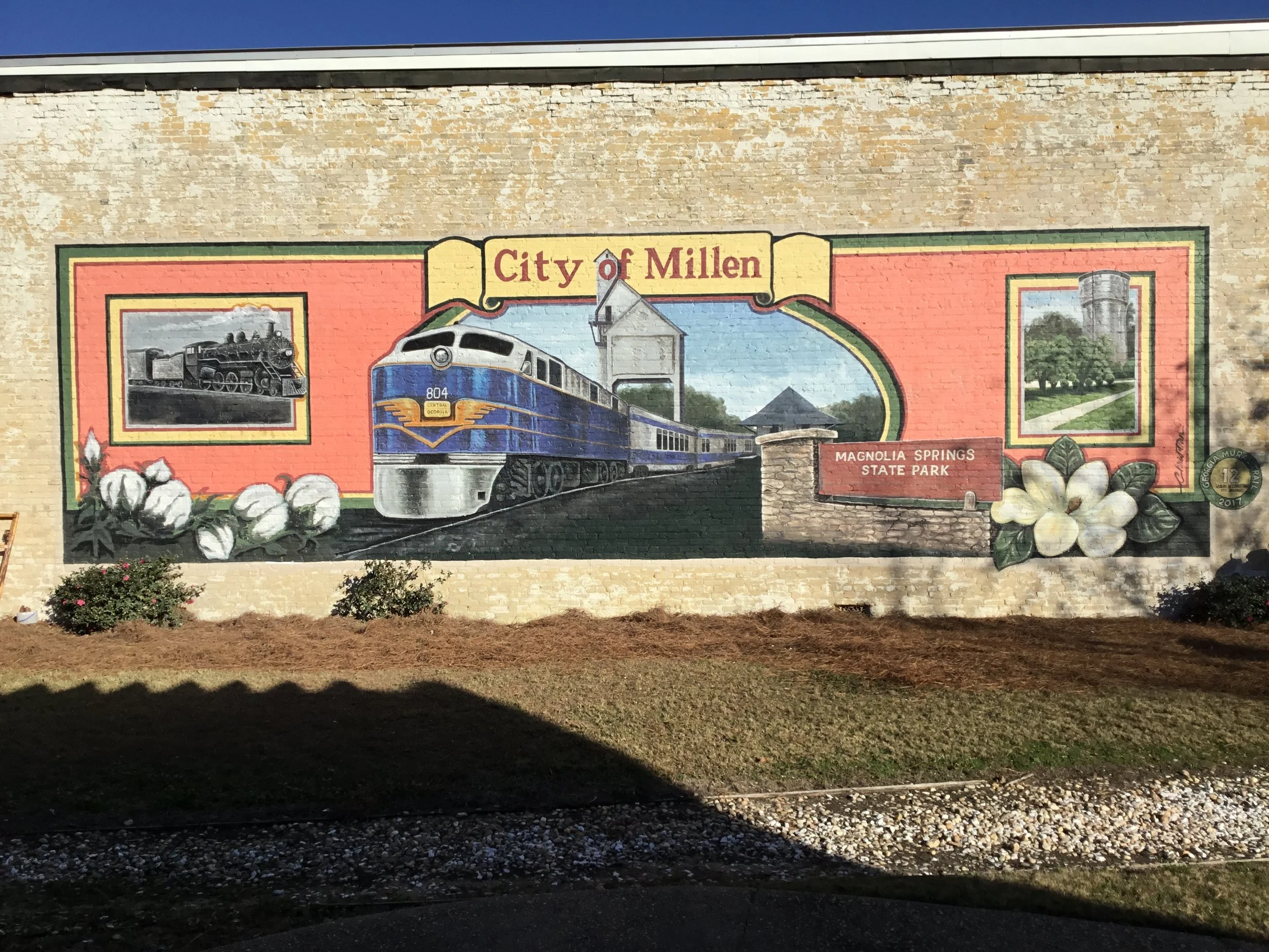 The city of Millen is a beautiful city 210 miles southeast of Atlanta. This mural is a salute to the (Georgia Southern “Nancy Hanks” Railroad). The mural is 12’x40’ and is painted on a 100 year old building on Cotton Street. This was the last mural painted in 2017.